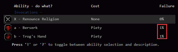 - Mutación: te puede dar una mutación buena o mala permanente, aunque tiene un poco más % de ser buena. Personalmente de 20 partidas solo 1 vez he usado una (no había llegado a Zot aún), cuando por cosas del juego tenía 2 mutaciones malas en rojo (con Shift + A las revisas) y me tomé una y eliminó las 2 malas y me las cambió por 3 buenas, pienso fue suerte.