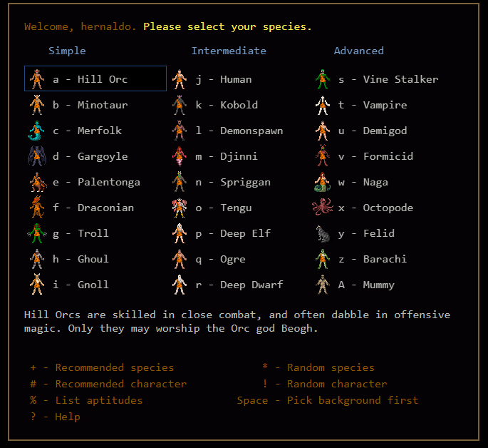 Ejemplo, se ve abajo un jugador DrCj que sería: Dr = especie Draconian, Cj = background Conjurer. Otros ejemplos:TRBE: Especie Troll , background Berserk (combo con dios Trog)